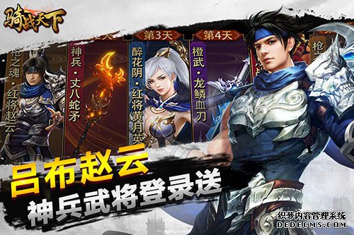 《骑战三国H5》开局就送白马银枪赵子龙,登陆第2天就送神兵丈八蛇矛,第7天更送无双神将吕布,还有更多神秘大礼等你来拿!