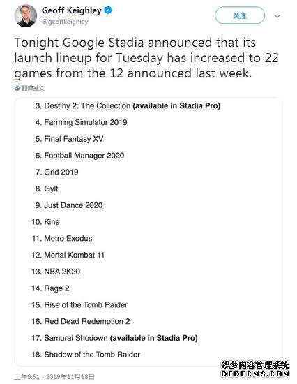 谷歌云游戏系统Stadia将于11月19日正式上线,今日TGA创始人Geoff Keighley发推称Stadia首发游戏将增至22款。