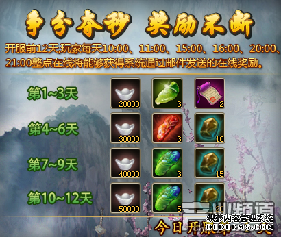 活动二:开服前十二天,玩家每天10:00、11:00、15:00、16:00、20:00、21:00整点在线将能够获得系统通过邮件发送的在线奖励,千万不要错过丰富的资源奖励