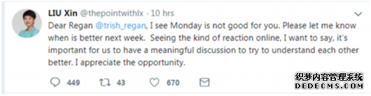 随后,刘欣在最新的推文中表示同意约辩。她在推文中写道:“翠西你好,如果你是真心实意地跟我约一场开诚布公的贸易辩论,,我们就约在下周一傍晚你的节目直播中进行。让你的团队通过推特联系我。我的名字不是中国国家电视台,我叫刘欣,你可以叫我欣。如果你愿意,我们美国东部时间周一傍晚见。”