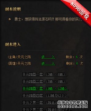 此时我们就需要通过阵法地图来刷材料提升阵法等级了,玩家需要在蓝月秘境找到NPC-归墟,即可进入天元之阵地图,天元之阵地图分为主角、英雄,每个副本每天都可以进入六次,不过每天只有第一次的时候是免费进入的,后续5次都是需要消耗道具“天元阵图”才能进入,天元阵图可以通过在商城-限购中购买获得,也可以通过超爽大爆的高级材料包获得。